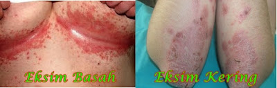 Eksim dapat dibedakan menjadi 2 yaitu eksim kering dan eksim basah. Eksim kering akan tampak pada kulitnya kering, bersisik, kemerah-merahan, kadang-kadang bengkak, dan terasa gatal. Sedangkan pada eksim basah kulitnya akan tampak merah, bengkak, melepuh, dan basah, timbul bintil-bintil yang mengandung air atau nanah yang menimbulkan rasa gatal.